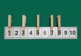 Con un par de docenas de pinzas de la ropa de madera, un rotu para escribir los números y la hoja de abajo impresa, recortada y plastificada nos vamos a montar un juego para el rincón de mates.